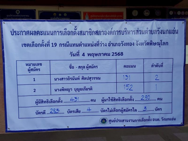 ผลการเลือกสมาชิกองค์การบริหารส่วนตำบลวังนกแอ่น เขตเลือกตั้งที่ 19 ผู้ที่ได้รับเลือกเป็นสมาชิกองค์การบริหารส่วนตำบลวังนกแอ่น เขตเลือกตั้งที่ 19 คือ ผู้สมัครหมายเลขที่ 2 นางสาวพิทญา บุญยเกียรติ ได้ 152 คะแนน บัตรดี 283 บัตร บัตรเสีย 4 บัตร บัตรดีที่ไม่ประสงค์ลงคะแนน 3 บัตร ผู้มีสิทธิ 431 คน มีผู้มาใช้สิทธิ 290 คน คิดเป็น 67.29 %