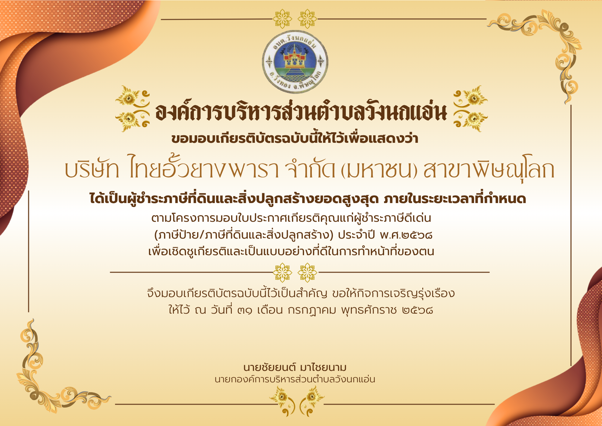 รายละเอียด : องค์การบริหารส่วนตำบลวังนกแอ่น จัด โครงการมอบใบประกาศเกียรติคุณแก่ผู้ชำระภาษีดีเด่น ประจำปี 2568 เพื่อเชิดชูเกียรติและขอบคุณผู้เสียภาษีที่มีความรับผิดชอบต่อหน้าที่พลเมือง โดยในปีนี้ได้มอบใบประกาศให้กับผู้ชำระภาษีดีเด่นประเภท ภาษีป้าย จำนวน 4 ราย(มารับด้วยตัวเองจำนวน 2 ราย)