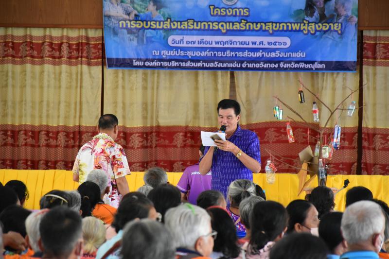 รายละเอียด : วันที่ 17 พฤศจิกายน 2566 เวลา 09.00 น. อบต.วังนกแอ่น จัดโครงการอบรมส่งเสริมการดูแลรักษาสุขภาพผู้สูงอายุ ณ ศูนย์ประชุม องค์การบริหารส่วนตำบลวังนกแอ่น จำนวน 219 คน เพื่ออบรมให้ความรู้ การดูแลรักษาสุขภาพแก่ผู้สูงอายุ มีการพบปะ การแลกเปลี่ยนเรียนรู้ประสบการณ์ ส่งเสริมการออกกำลังกายให้กับผู้สูงอายุอย่างสม่ำเสมอ และถูกวิธี จากนางสาวคนึงนิด นาสมใจ(ข้าราชการเกษียณวิทยาลัยบึงพระพิษณุโลก) รวมทั้งมีการสาธิตการทิ้งขยะให้ตรงประเภทขยะ จากเจ้าหน้าที่องค์การบริหารส่วนตำบลวังนกแอ่น