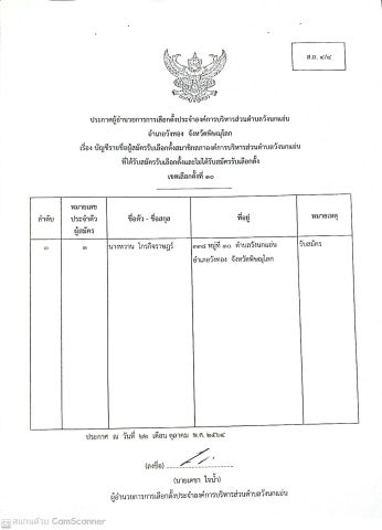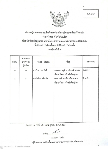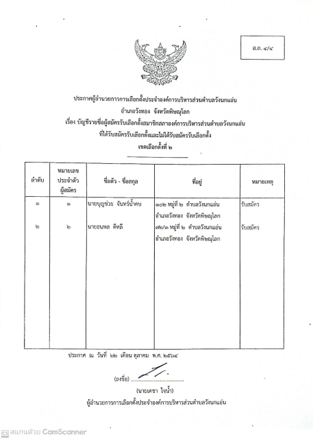 ประกาศผู้อำนวยการการเลือกตั้งประจำองค์การบริหารส่วนตำบลวังนกแอ่น เรื่อง บัญชีรายชื่อผู้สมัครรับเลือกตั้งนายกองค์การบริหารส่วนตำบลวังนกแอ่น ที่ได้รับสมัครรับเลือกตั้งและไม่ได้รับสมัครรับเลือกตั้ง (ผ.ถ.4/4) (ส.ถ.4/4) ลงวันที่ 22 ตุลาคม 2564