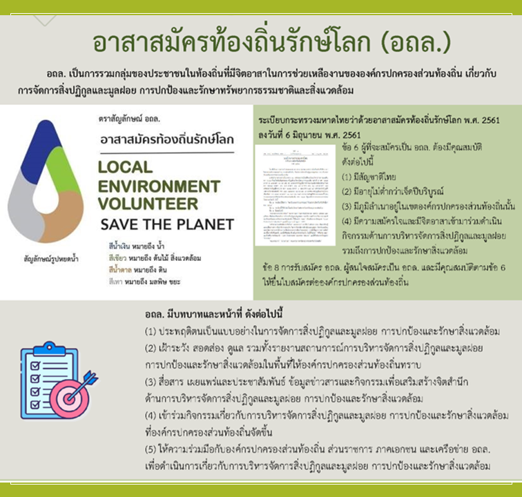 รายละเอียด : ความหมายและสัญลักษณ์ของ อถล. อถล. เป็นการรวมกลุ่มของประชาชนในท้องถิ่นที่มีจิตอาสาในการช่วยเหลืองานขององค์กรปกครองส่วนท้องถิ่น เกี่ยวกับการจัดการสิ่งปฏิกูลและมูลฝอย การปกป้องและรักษาทรัพยากรธรรมชาติและสิ่งแวดล้อม “อาสาสมัครท้องถิ่นรักษ์โลก” หมายความว่า ประชาชนที่มีจิตอาสา สมัครใจ เสียสละ และอุทิศตน เพื่อช่วยเหลืองานด้านการจัดการสิ่งปฏิกูลและมูลฝอย การปกป้อง และรักษาทรัพยากรธรรมชาติ และสิ่งแวดล้อมขององค์กรปกครองส่วนท้องถิ่น ใช้ชื่อย่อว่า “อถล.” มีชื่อเรียกภาษาอังกฤษว่า “Local Environment Volunteer” และใช้ชื่อย่อภาษาอังกฤษว่า “LEV” “เครือข่ายอาสาสมัครท้องถิ่นรักษ์โลก” หมายความว่า การเชื่อมโยงกันของ อถล. เพื่อการเรียนรู้แลกเปลี่ยนข่าวสาร หรือทํากิจกรรมร่วมกัน ในการบริหารจัดการสิ่งปฏิกูลและมูลฝอย รักษาสิ่งแวดล้อมและทรัพยากรธรรมชาติด้วยความเป็นอิสระและเท่าเทียมกันของบุคคล ภายใต้พื้นฐานการเคารพสิทธิและเอื้ออาทรซึ่งกันและกัน และใช้หลักธรรมาภิบาลในการทํางานร่วมกัน โดยใช้ชื่อย่อว่า “เครือข่าย อถล.” และเรียกชื่อภาษาอังกฤษว่า “Local Environment Volunteer Network” และใช้ชื่อย่อภาษาอังกฤษว่า “LEV-Net"