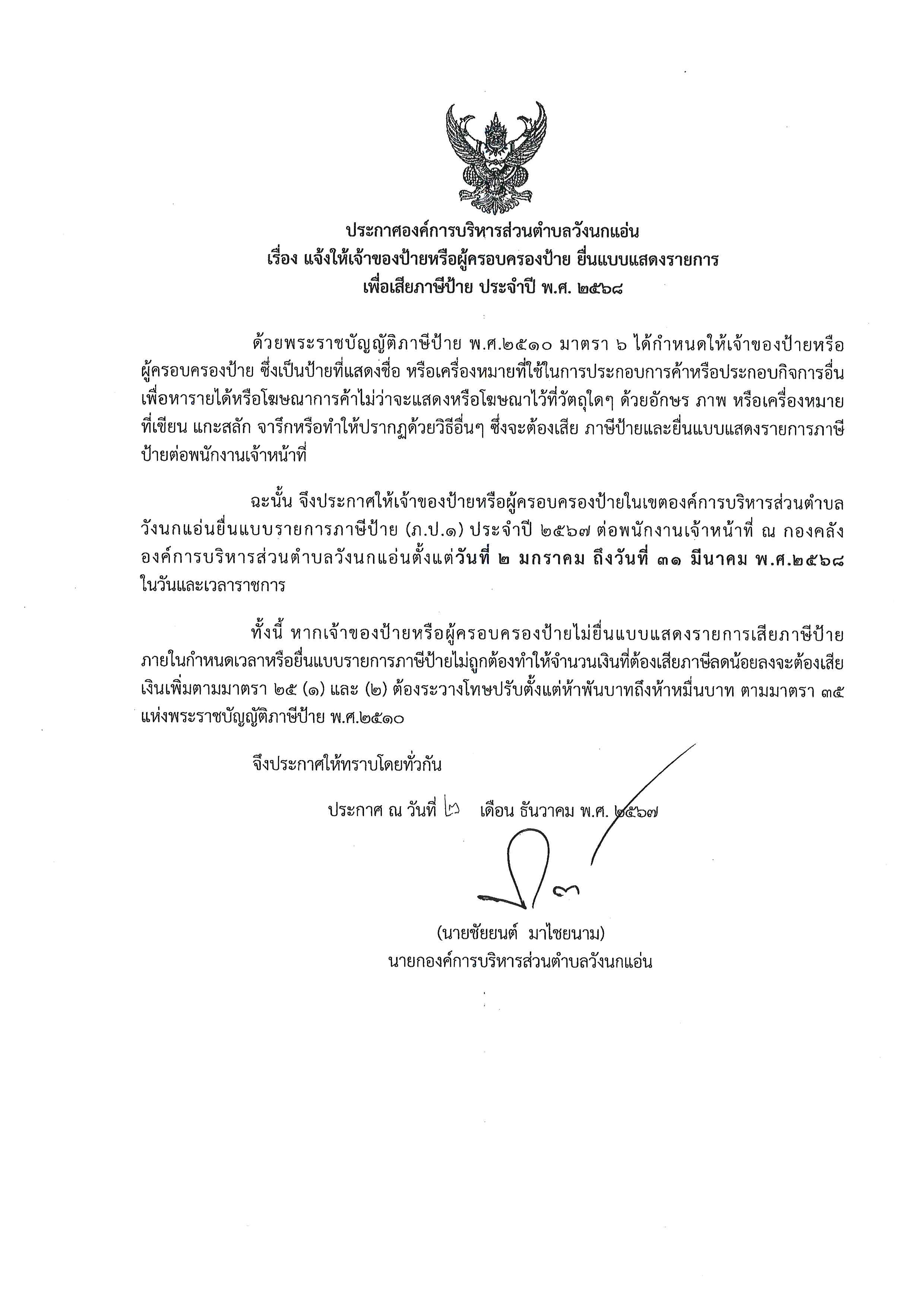 ชื่อเรื่อง : ประกาศองค์การบริหารส่วนตำบลวังนกแอ่น เรื่อง แจ้งให้เจ้าของป้ายหรือผู้ครอบครองป้าย ยื่นแบบแสดงรายการเพื่อเสียภาษีป้าย ประจำปี พ.ศ. 2568