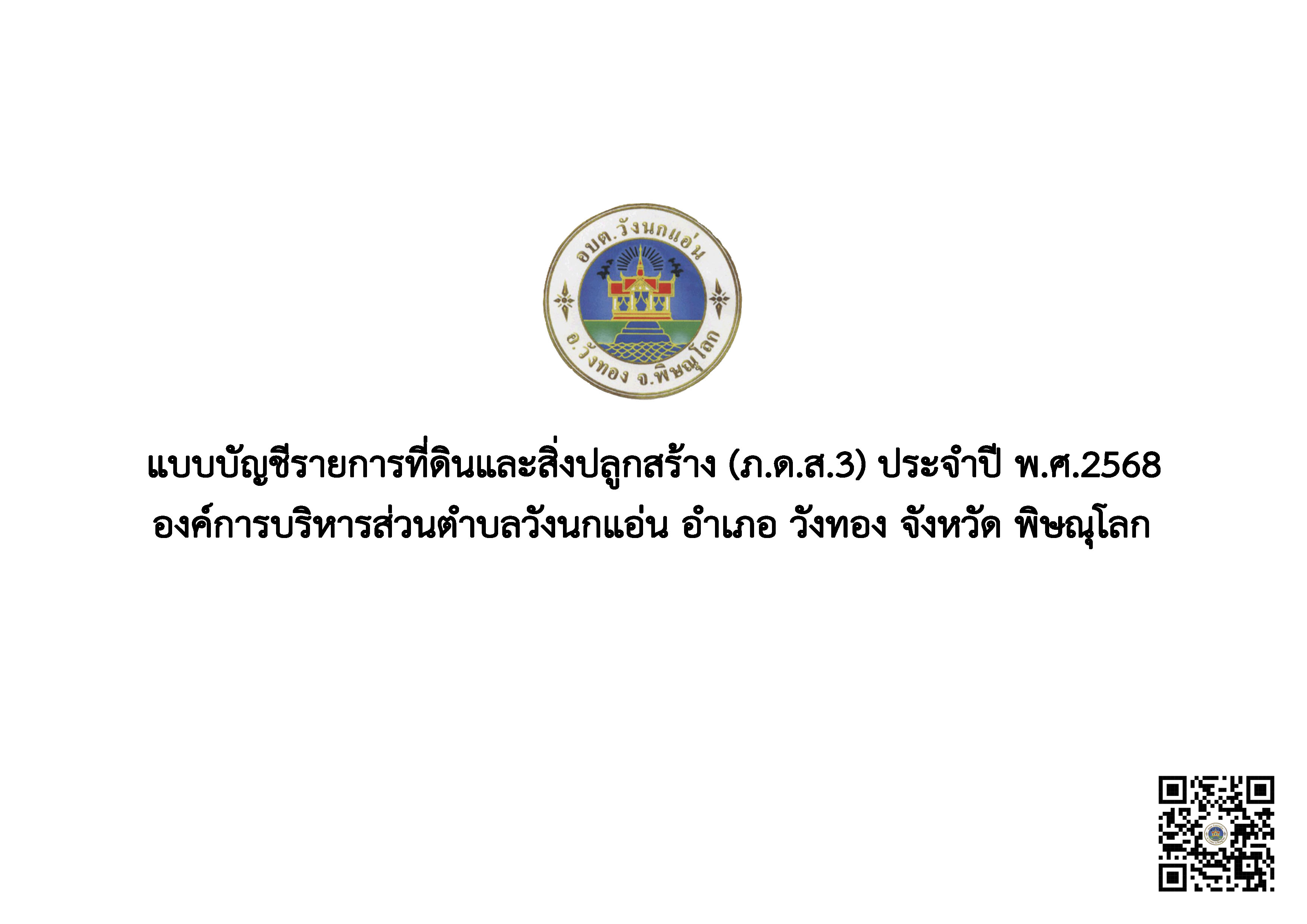 ประกาศองค์การบริหารส่วนตำบลวังนกแอ่น อำเภอวังทอง จังหวัดพิษณูโลก เรื่อง ประกาศบัญชีรายการที่ดินและสิ่งปลูกสร้าง(ภ.ด.ส.3) ประจำปี พ.ศ.2568