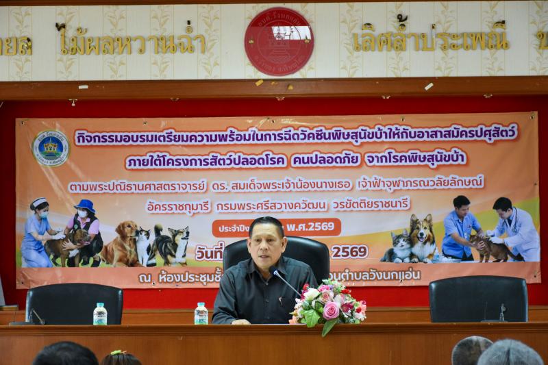 วันที่ 13 มีนาคม พ.ศ. 2569 องค์การบริหารส่วนตำบลวังนกแอ่น จัดกิจกรรม อบรมเตรียมความพร้อมในการฉีดวัคซีนป้องกันโรคพิษสุนัขบ้าให้กับอาสาสมัครปศุสัตว์ ภายใต้โครงการ สัตว์ปลอดโรค คนปลอดภัย จากโรคพิษสุนัขบ้า ตามพระปณิธานศาสตราจารย์ ดร.สมเด็จพระเจ้าน้องนางเธอ เจ้าฟ้าจุฬาภรณวลัยลักษณ์ อัครราชกุมารี กรมพระศรีสวางควัฒน วรขัตติยราชนารี ประจำปีงบประมาณ พ.ศ. 2569 ณ ห้องประชุมชั้น 2 องค์การบริหารส่วนตำบลวังนกแอ่น อำเภอวังทอง จังหวัดพิษณุโลก การอบรมครั้งนี้มีวัตถุประสงค์เพื่อเตรียมความพร้อมให้กับอาสาสมัครปศุสัตว์ในพื้นที่ ในการดำเนินงานฉีดวัคซีนป้องกันโรคพิษสุนัขบ้าให้กับสุนัขและแมวอย่างถูกต้องตามหลักวิชาการ รวมทั้งสร้างความรู้ความเข้าใจเกี่ยวกับการป้องกันและควบคุมโรคพิษสุนัขบ้าในชุมชน ทั้งนี้ เพื่อให้เกิดความร่วมมือในการเฝ้าระวัง ป้องกัน และควบคุมโรคพิษสุนัขบ้าในพื้นที่ตำบลวังนกแอ่น อันจะนำไปสู่เป้าหมาย “สัตว์ปลอดโรค คนปลอดภัย” และสร้างความปลอดภัยให้กับประชาชนในชุมชนอย่างยั่งยืน