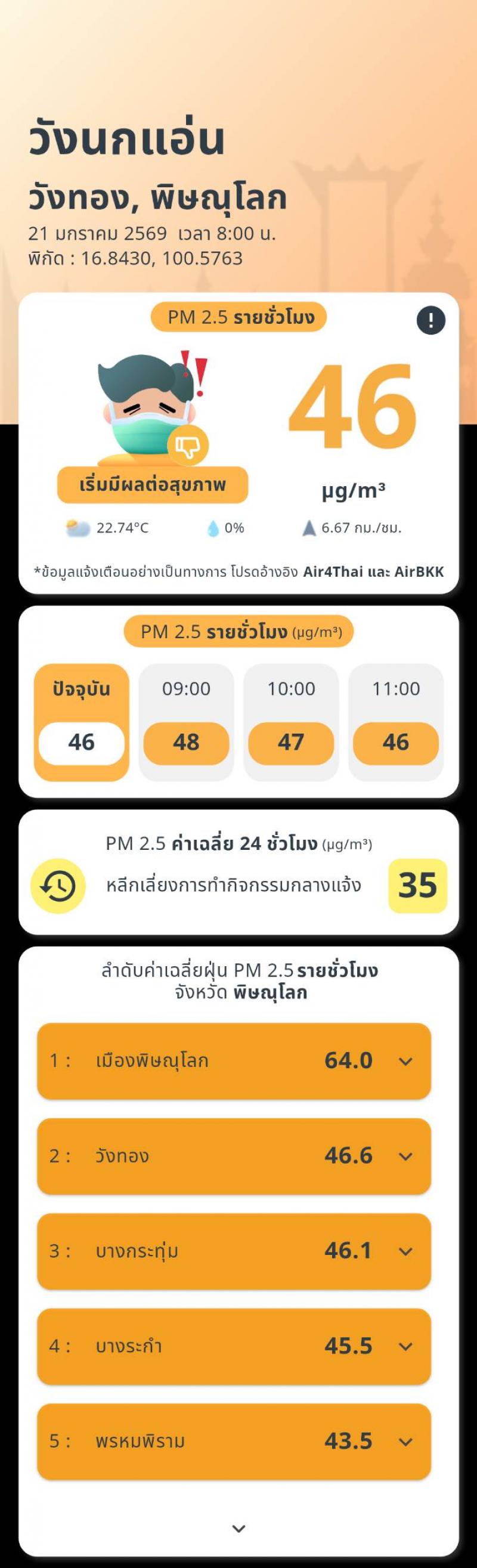 description วันพุธที่ 21 มกราคม 2569 เวลา 08.00 น. จากข้อมูลการตรวจวัดคุณภาพอากาศในพื้นที่ อำเภอวังทอง จังหวัดพิษณุโลก พบค่าฝุ่นละอองขนาดเล็ก PM 2.5 = 46 ไมโครกรัมต่อลูกบาศก์เมตร (µg/m³) อยู่ในระดับ เริ่มมีผลกระทบต่อสุขภาพ ค่าเฉลี่ย PM 2.5 ย้อนหลัง 24 ชั่วโมง = 35 µg/m³ คำแนะนำด้านสุขภาพ ประชาชนควรหลีกเลี่ยงการทำกิจกรรมกลางแจ้งเป็นเวลานาน สวมหน้ากากอนามัยเมื่อออกนอกอาคาร กลุ่มเสี่ยง เช่น เด็ก ผู้สูงอายุ และผู้มีโรคประจำตัว ควรดูแลสุขภาพเป็นพิเศษ องค์การบริหารส่วนตำบลวังนกแอ่น ขอความร่วมมือประชาชน งดการเผาในที่โล่งทุกชนิด และติดตามสถานการณ์คุณภาพอากาศอย่างใกล้ชิด ข้อมูลจาก Air4Thai และ AirBKK person admin
