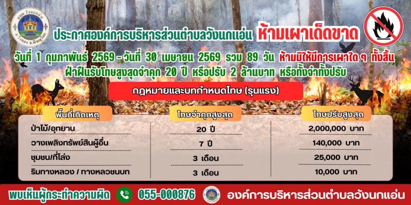 description องค์การบริหารส่วนตำบลวังนกแอ่น ขอแจ้งประชาชนในพื้นที่ จากข้อมูลการตรวจวัดคุณภาพอากาศ พบว่าค่าฝุ่นละอองขนาดเล็ก PM 2.5 อยู่ในระดับเริ่มมีผลกระทบต่อสุขภาพ ขอความร่วมมือประชาชน งดการเผาในที่โล่งทุกชนิด เพื่อช่วยลดมลพิษทางอากาศ ลดหมอกควัน และป้องกันผลกระทบต่อสุขภาพของทุกคน งดเผา เพื่อลดฝุ่น PM 2.5 การเผาในที่โล่งก่อให้เกิดผลกระทบหลายประการ ได้แก่ 1. ผิดกฎหมาย 2. ทำให้ดินเสื่อมโทรม 3. เกิดฝุ่นละออง หมอกควัน และก๊าซพิษ 4. ส่งผลกระทบต่อสุขภาพประชาชน 5. ทำให้โลกร้อนและสภาพอากาศแปรปรวน ขอแจ้งเตือน องค์การบริหารส่วนตำบลวังนกแอ่น มีมาตรการ ห้ามเผาเด็ดขาด ผู้ฝ่าฝืนมีโทษตามกฎหมาย ทั้งจำและปรับ หากพบเห็นการลักลอบเผา หรือการกระทำที่ก่อให้เกิดมลพิษ แจ้งได้ที่ อบต.วังนกแอ่น โทร. 055-000876 ร่วมมือกันดูแลสิ่งแวดล้อม ลดปัญหาฝุ่น PM 2.5 เพื่อสุขภาพที่ดีของพี่น้องประชาชนตำบลวังนกแอ่นทุกคน person admin