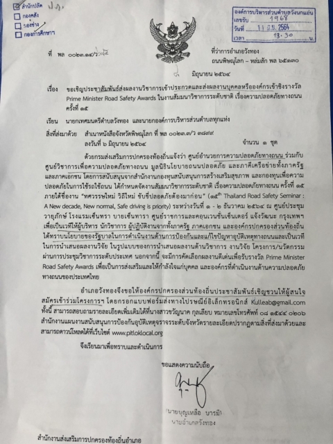 ชื่อเรื่อง : ประกาศขอเชิญส่งผลงานวิชาการเข้าประกวดและส่งผลงานบุคคลหรือองค์กรเข้าชิงรางวัล Prime Minister Road Safety Awards ในงานสัมนาวิชาการระดับชาติ เรื่องความปลอดภัยทางถนน ครั้งที่ 15