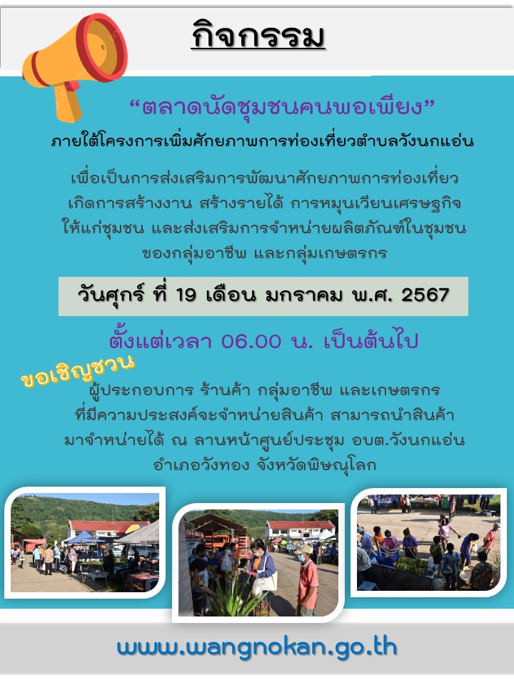 ชื่อเรื่อง : ประชาสัมพันธ์การจัดกิจกรรม "ตลาดนัดชุมชนคนพอเพียง" ภายใต้โครงการเพิ่มศักยภาพการท่องเที่ยวตำบลวังนกแอ่น