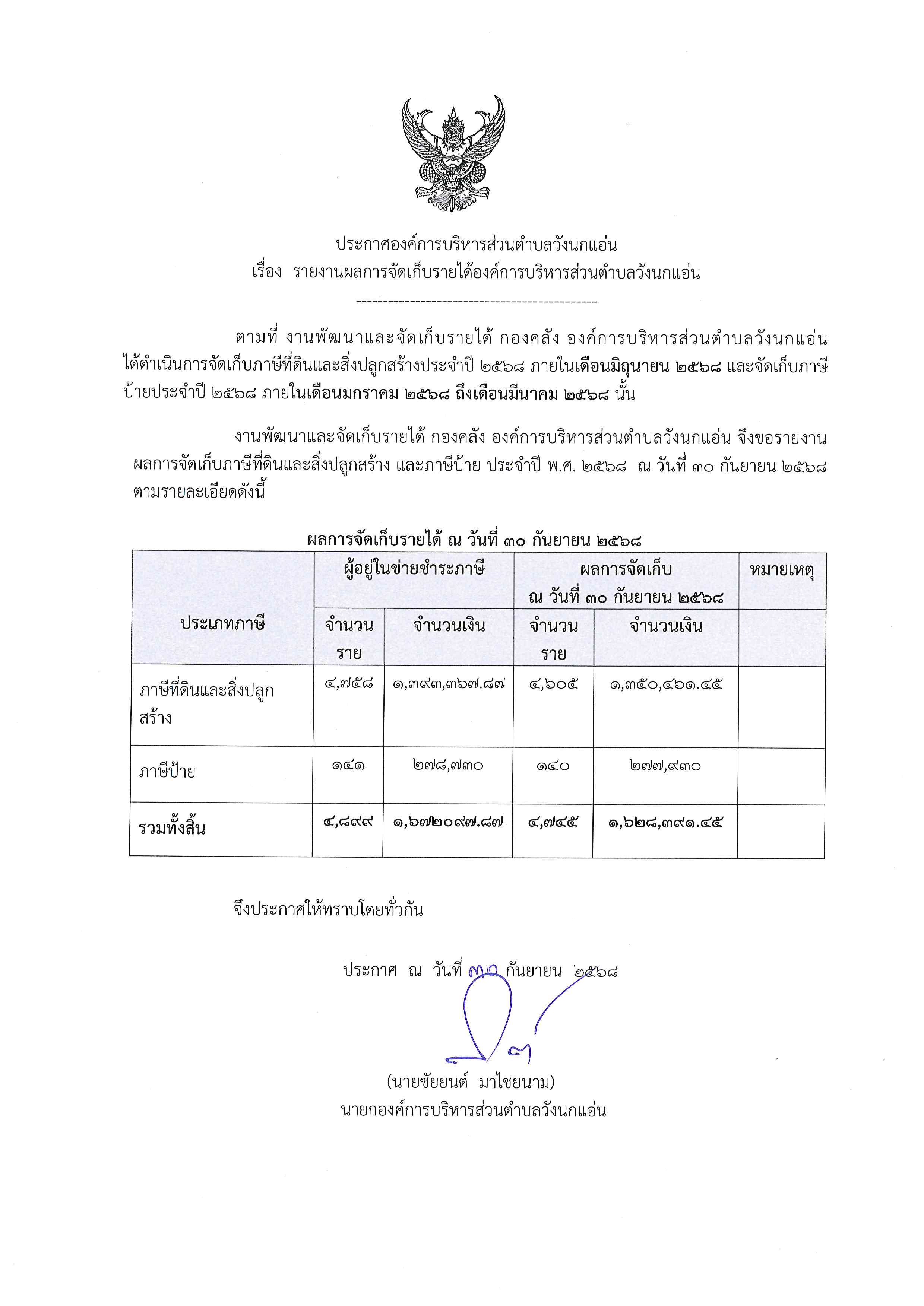 ประกาศองค์การบริหารส่วนตำบลวังนกแอ่น เรื่อง รายงานผลการจัดเก็บรายได้ขององค์การบริหารส่วนตำบลวังนกแอ่น