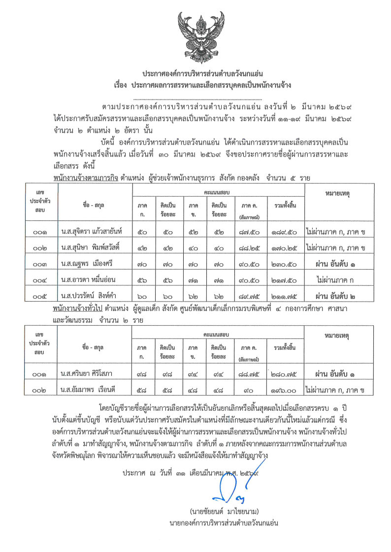 ประกาศองค์การบริหารส่วนตำบลวังนกแอ่น เรื่อง ประกาศผลการสรรหาและเลือกสรรบุคคลเป็นพนักงานจ้าง