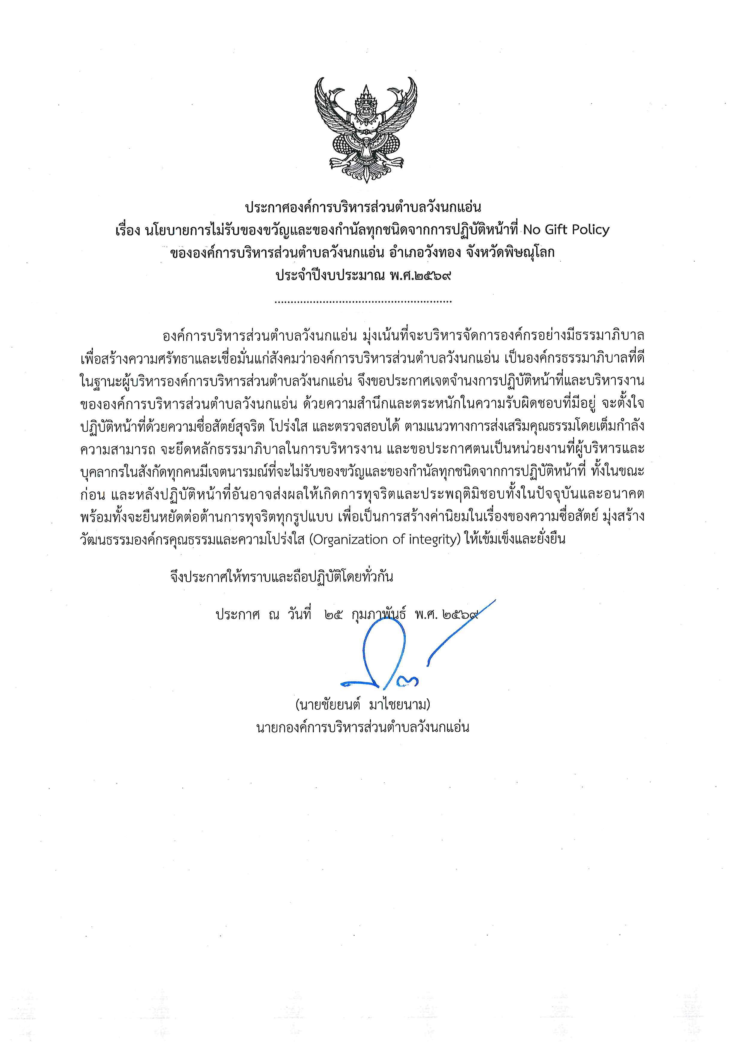 ประกาศ อบต.วังนกแอ่น เรื่อง นโยบายการไม่รับของขวัญและของกำนัลทุกชนิดจากการปฏิบัติหน้าที่ No Gift Policy ของ อบต.วังนกแอ่น ประำจปีงบประมาณ พ.ศ. 2569