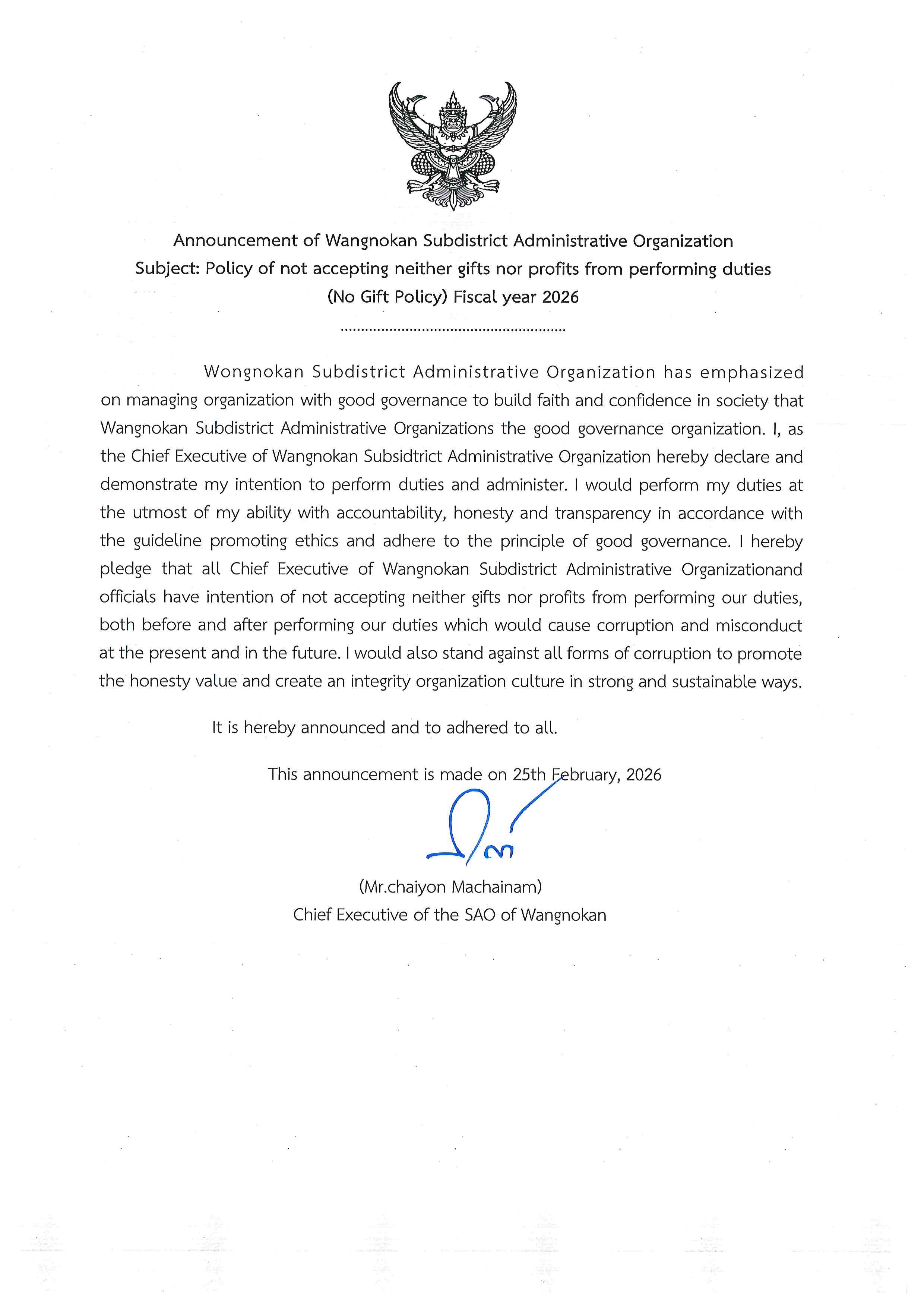 Announcement of Wangnokan Subsidtrict Administrative Organization Subject:Policy of not accepting neither gifts nor profits from performing duties (No Gift Policy) Fiscal year 2026